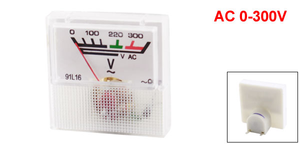 Product Name Analog Voltmeter Model 91L16 Measuring Current Range AC 0-300V Accuracy 5.0 Pin Number 2 Panel Size(Approx) 40 x 40 x 12mm/1.6" x 1.6" x 0.47"(L*W*T) Overall Depth(Not Included Screw ) 25mm/ 1" Color White, Clear Net Weight 12g Package Content 1 x Analog Voltmeter - Reviews
