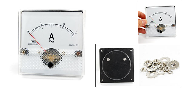DetailsAC 0-3A Plastic Housed Analog Panel Meter Ammeter YS-80  Product Name Analog Ammeter Model YS-80 Measuring Current Range AC 0-3A Accuracy Class 2.5 Meter Face Size(Approx.) 8.2 x 8.2 x 1.3cm / 3.2" x 3.2" x 0.5" (L*W*H) Thread Size 0.2 x 1cm / 0.08" x 0.39" (D*L) 0.4 x 1.4cm / 0.16" x 0.55" (D*L) Total Thickness 5cm / 2" Material Plastic, Electronic Components Color White, Black Net Weight 104g Package Content 1 x Analog Ammeter Installation kits