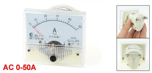 Product Name Analog Ammeter Measuring Current Range AC 0-50A Accuracy Class 2.5 Meter Face Size 6.4 x 5.6 x 1.04cm / 2.5" x 2.2" x 0.4" (L*W*T) Thread Size 0.38 x 0.75cm / 0.15" x 0.29"(Dia.*L) Overall Depth 5.76cm / 2.3" Material Plastic, Electronic Components Color White Net Weight 112g Package Content 1 x Analog Ammeter