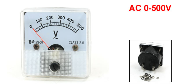 Product Name Analog Voltmeter Model YS-50 Measuring Voltage Range AC 0-500V Accuracy Class 2.5 Total Size(Approx) 5 x 5 x 4.5cm/2" x 2" x 1.8"(L*W*T) Thread Dia. 3mm/0.12", 4mm/0.16" Color Clear, White, Black Weight 68g Package Content 1 x Analog Voltmeter