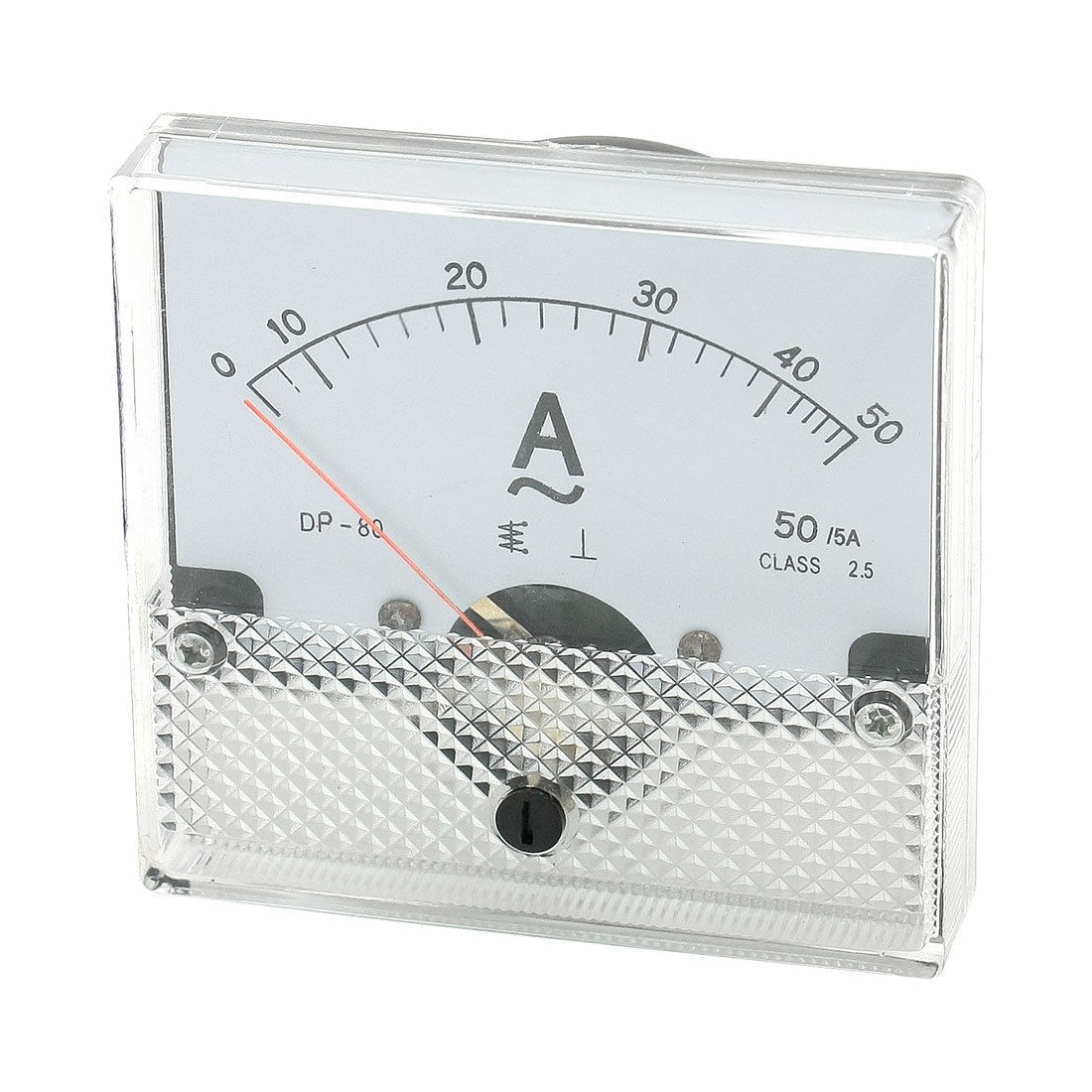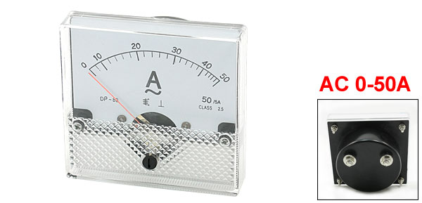 Product Name Analog Ammeter Model BP-80 Measuring Current Range AC 0-50A Accuracy Class 2.5 Meter Face Size(Approx.) 8.2 x 8.2 x 1.4cm / 3.2" x 3.2" x 0.55" (L*W*H) Total Thickness 5.2cm / 2" Mounting Thread Dia. 5mm/ 0.12", 3mm/ 0.12" Material Plastic, Electronic Components Color White, Black Weight 103g Package Content 1 x Analog Ammeter