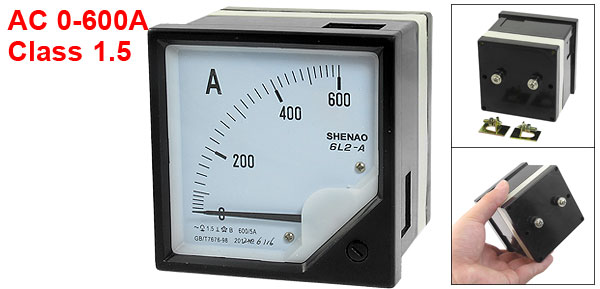 Product Name Analog Ammeter Model 6L2-A Measuring Current Range AC 0-600A Accuracy Class 1.5 Working Temperature -20-+50°C Relative Humidity <=96% Meter Face Size(Approx.) 8 x 8cm/ 3.1" x 3.1"(L*W*T) Thread Size 0.4 x 1cm / 0.16" x 0.4"(D*L) Base Diameter 10.4cm/ 4.1" Screw Spacing 3.5cm/ 1.377" Main Color Black Net Weight 190g Package Content 1 x Analog Ammeter