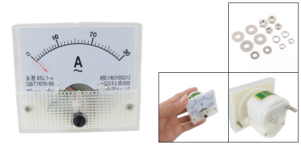 Product Name Analog Amperemeter Model 85L1-A Measuring Ampere Range AC 1-30A Accuracy Class 2.5 Meter Face Size(Approx) 6.3 x 5.5 x 1cm / 2.5" x 2.2" x 0.39"(L*W*T) Thread Size 0.37 x 0.83cm / 0.15" x 0.33"(D*L) Overall Depth 5.77cm / 2.27" Color White Net Weight 96g Package Content 1 x Analog Amperemeter Several Installing Parts - Reviews