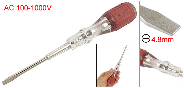 AC100-1000V Handle Material Plastic Slotted Bit Width 4.8mm/0.18" Size(Approx.) 18 x 2.3cm/7" x 0.9"(L*Dia.) Color Red, Silver Tone, Clear Net Weight 45g Package Content 1 x Testing Screwdriver - Reviews