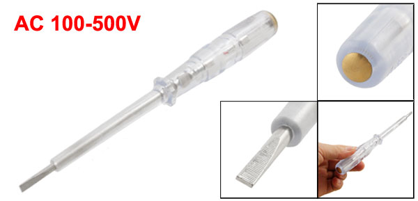 Product Name Voltage Detector Tester Material Plastic, Metal Voltage AC 100-500V Tip Size (Approx.) 4mm/0.16" Total Size (Approx.) 185 x 18mm/7.3" x 0.7" (L*D) Handle Color Clear Net Weight 38g Package Content 1 x Voltage Detector Tester - Reviews
