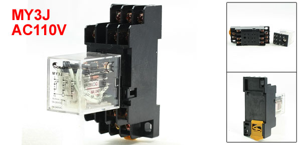 Product Name Electromagnetic Relay Model MY3J Coil Voltage AC110V Contact Capacity 5A 250VAC /28VDC Type 3PDT Number of Terminals 11 Mount Rail Type 35mm DIN Rail Fixing Mount Hole Size 6 x 4mm/0.24" x 0.16"(L*W) Total Size (Approx.) 71 x 30 x 65mm/2.8" x 1.2" x 2.6"(L*W*H) Shell Material Plastic Main Color Black, Clear Blue Net Weight 68g Package Content 1 x Electromagnetic Relay - Reviews