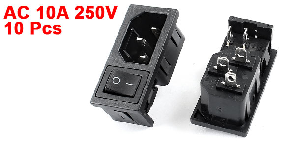AC 10A 250V 2 Pin Black Rocker Switch IEC320 C14 Inlet Power Socket 10 Pcs