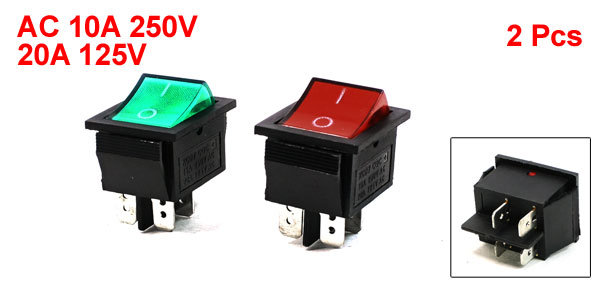 Rated Voltage AC 10A 250V/20A 125V Terminals 4 Pins Position On-Off Lamp Color Red, Green Overall Size 31 x 25 x 33mm / 1.2" x 1" x 1.3" (L*W*H) Mounting Size 27 x 21mm / 1.1" x 0.8" (L*W) Color Black, Green, Red Material Plastic, Metal Total Weight 24g Package Content 2 x Rocker Switches - Reviews