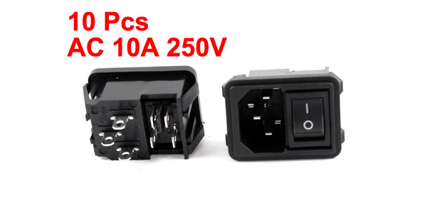 AC 10A 250V 4 Pin Black Button Rocker Switch IEC320 C14 Inlet Power Socket 10Pcs