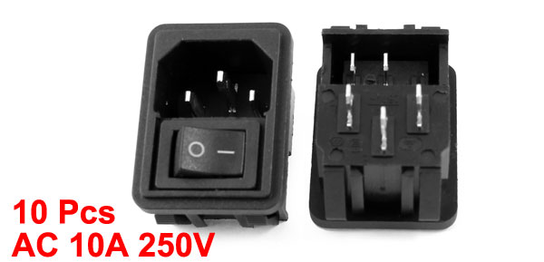 AC 10A 250V Black Button Rocker Switch IEC320 C14 Inlet Power Socket 10 Pcs