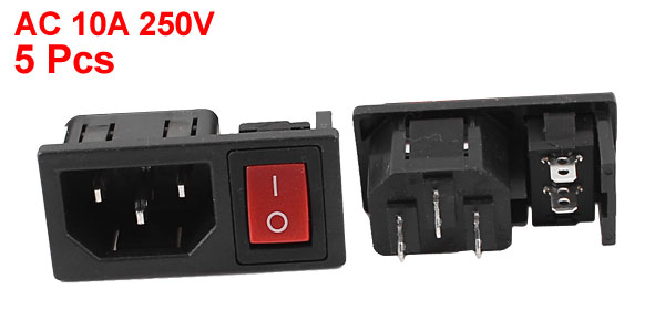 AC 10A 250V ON/OFF Red Button Rocker Switch IEC320 C14 Inlet Power Socket 5 Pcs