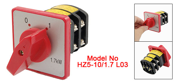 Product Name Combination Switch Model No. HZ5-10/1.7 L03 Ui AC 380V, 1.7KW Ith AC10A Terminal Number 8 Overall Size 6 x 6 x 8.5cm / 2.4" x 2.4" x 3.3" (L*W*H) Bottom Screw Dia 3.8mm / 0.15" Bottom Size 4.4 x 4.2cm / 1.7" x 1.6"(L*W)