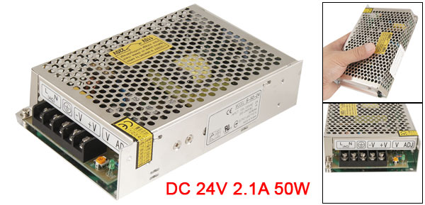Item Name Switching Power Supply Model No. S-50-24 Power Type Constant Voltage Input AC 100-120V, 2A, 50/60Hz AC 200-240V, 1A, 50/60Hz Output DC 24V, 2.1A DC Output Power 50W Size 15.9 x 9.7 x 3.8cm/ 6.3" x 3.8" x 1.5" (L*W*T) Case Material Metal Main Color Silver Tone Net Weight 439g Package Content 1 x Switching Power Supply - Reviews