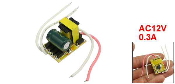 DetailsAC 110-220V to AC12V 0.3A 3x1W LED Driver Power Supply  Product Name LED Driver Power Suppply Output Power 1W Application for 3x1W LED Input Voltage AC110-220V Output Voltage AC12V Constant Current 0.3A Size (not include cable) 23 x 16 x 15mm / 0.9" x 0.6" x 0.59" (L*W*H) Material Electronics Color Pink, White, Green, Yellow, Black Weight 7g Package 1 x LED Driver Power Suppply