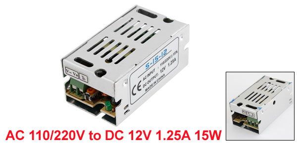 Product Name Switching Power Supply Input(AC) AC 110/220V ±15% Output(DC) DC 12V 1.25A Power 15W Material Metal, Electronic Parts Size(Approx) 7 x 4 x 3cm/ 2.7" x 1.5" x 1.2"(L*W*T) Color Silver Tone Weight 56g Package Content 1 x Switching Power Supply - Reviews