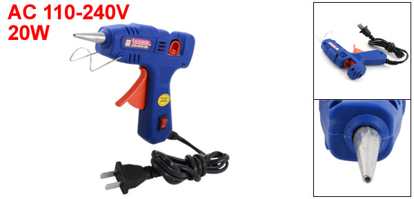 Product Name Hot Melt Glue Gun Main Material Plastic, Metal Model KD-T5 Plug Type US Plug Input Voltage AC 110-240V, 50/60Hz Rated Power 20W Fit for Hot Melt Glue Stick Dia 7mm (Not Included) Glue Gun Nozzle Inner Dia 2mm Gun Dimension 13.5 x 11 x 2.5cm /5.2" x 4.3" x 1" (L*W*H) Cable Length 100cm /3.3ft Main Color Blue Weight 140g Package Content 1 x Hot Melt Glue Gun