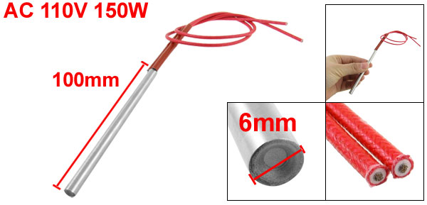 Product Name Cartridge Heater Material Stainless Steel, PVC, Nylon Rated Voltage AC 110V Power 150W Heater Size (Approx.) 6 x 100mm / 0.24" x 3.9" (D * L ) Wire Length (Approx.) 32.5cm / 12.8" Color Silver Tone, Red Weight 22g Package Content 1 x Cartridge Heater - Reviews