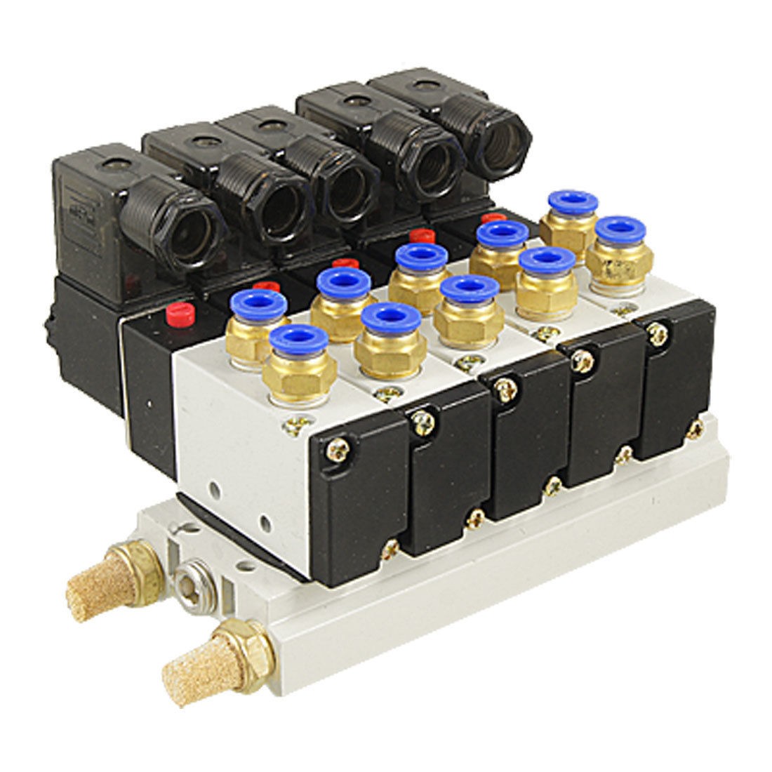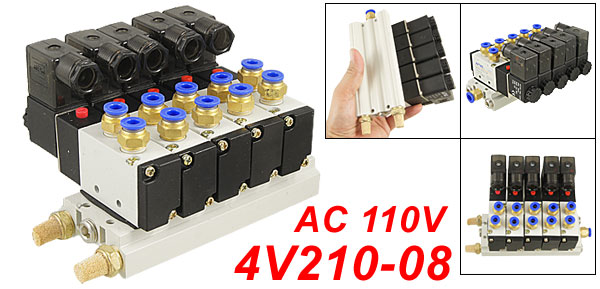DetailsAC 110V 2 Position 5 Way Single Head 5 Pneumatic Solenoid Valve w Base  Product Name 5 Solenoid Valve w Base Muffler Model 4V210-08 Working Pressure 0.15~0.8Mpa Working Voltage AC 110V Working Power 2.5VA Position & Way Number 2 Position 5 Way Base Size 13.5 x 5.8 x 2.3cm/ 5.3'' x 2.3'' x 0.9'' (L*W*T) Quick Fitting Inner Dia. Solenoid Valve: 0.6cm/15/64'' Base: 0.8cm/5/16'' Muffler Size 1.25 x 2.85cm/ 0.5'' x 1.1'' (Thread D* L) Mounted Hole Dia. 4mm/ 5/32'' Total Size 17.4 x 11.6 x 9cm/6.9'' x 4.6'' x 3.5'' (L*W*H) External Material Metal, Plastic, Brass Color As Picture Shown Net Weight 1383g Package Content 1 x 5 Solenoid Valve w Base Muffler