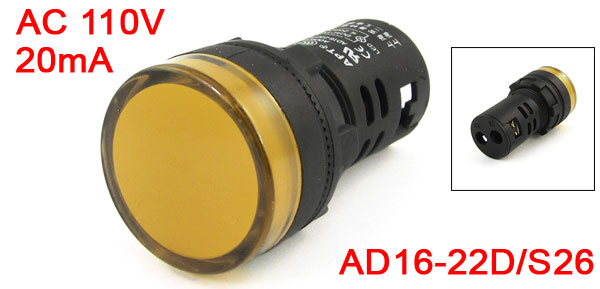DetailsAC 110V 20mA Screws Connection LED Signals Light Lamp Yellow AD16-22D/S26  Product Name LED Indicator Light Model No. AD16-22D/S26 Voltage AC 110V Current 20mA (Max.) Material Plastic, Electric Components Light Color Yellow Main Color Black, Yellow Size 5 x 2.8cm/ 2" x 1.1" (L*D) Weight 17g PakcageContent 1 x LED Indicator Light