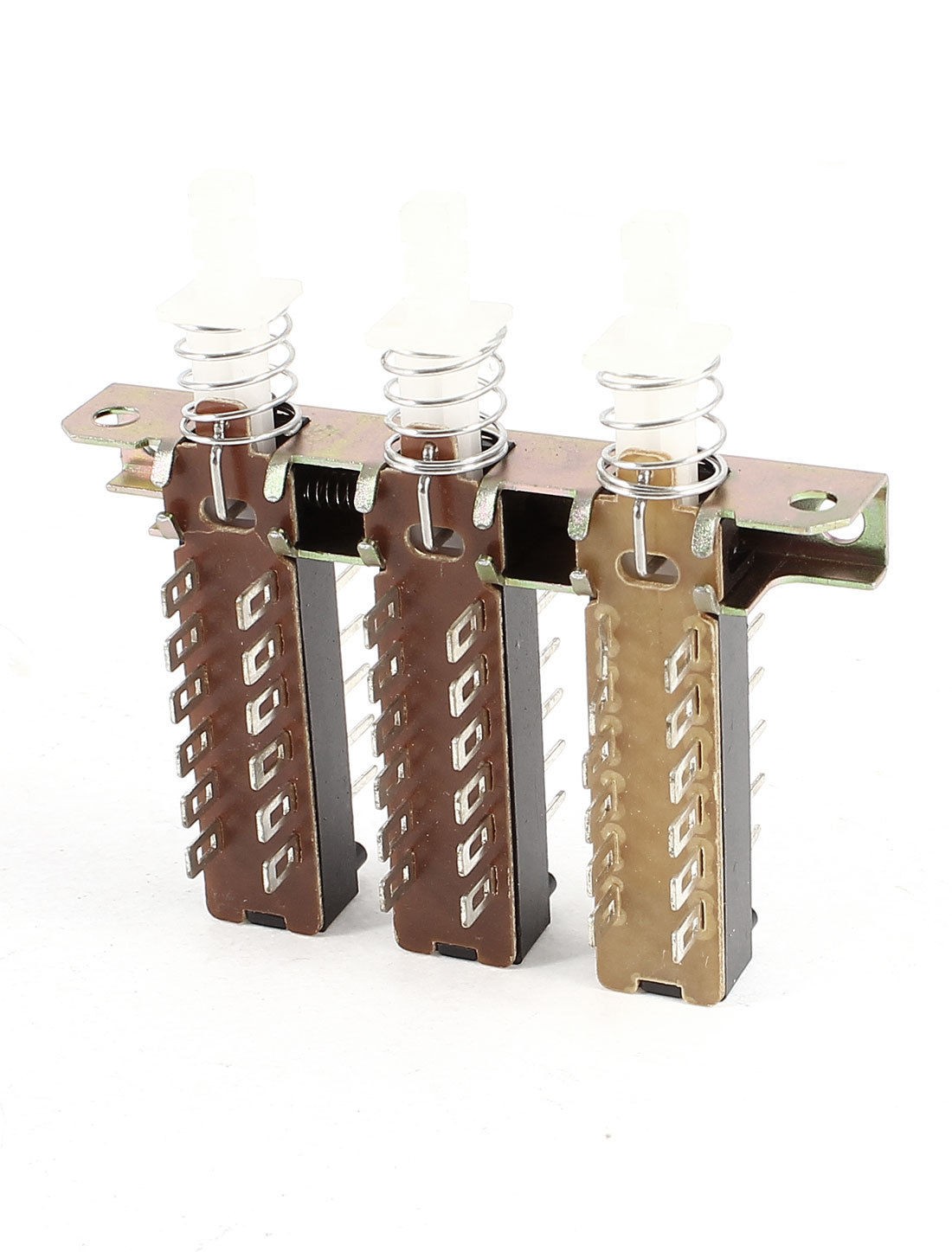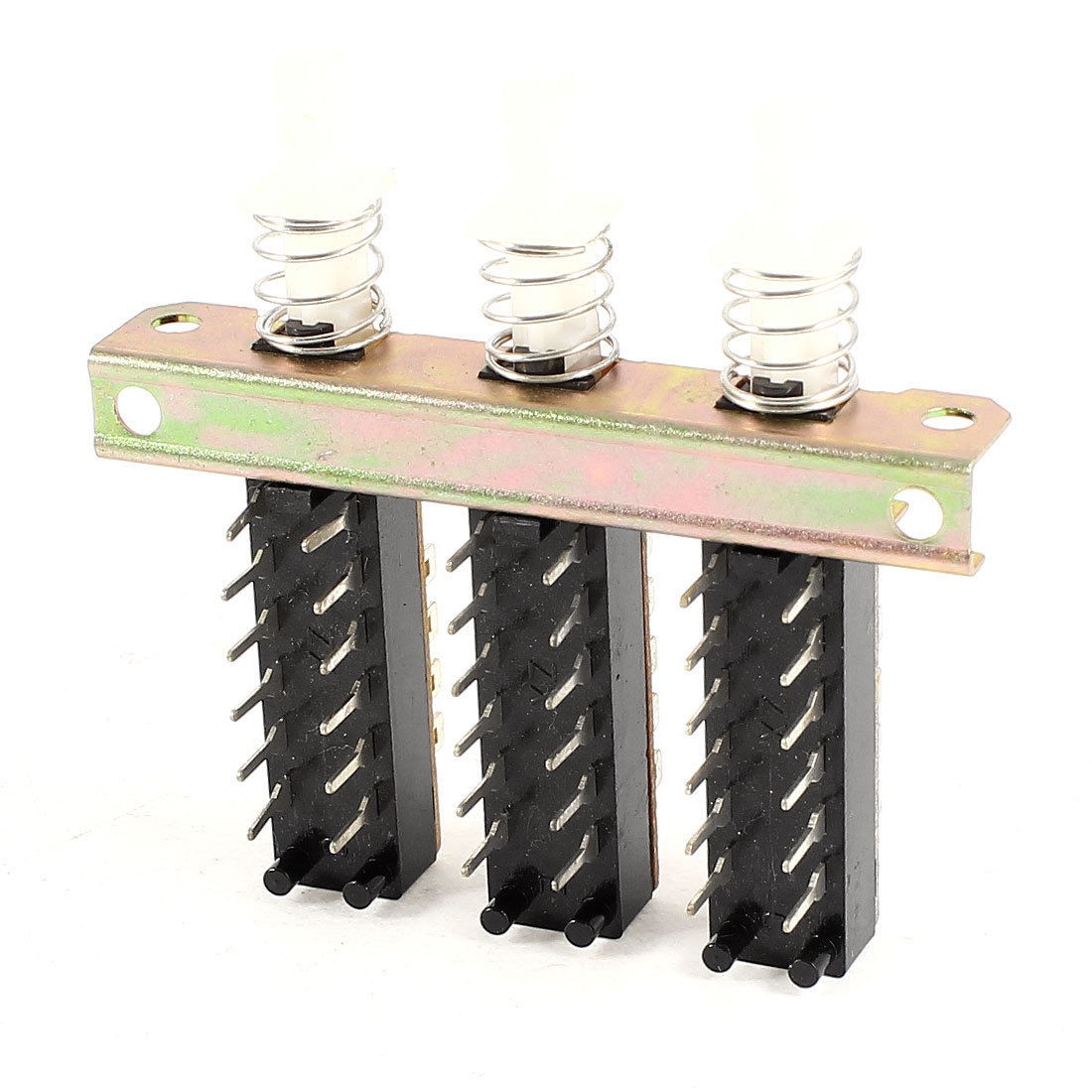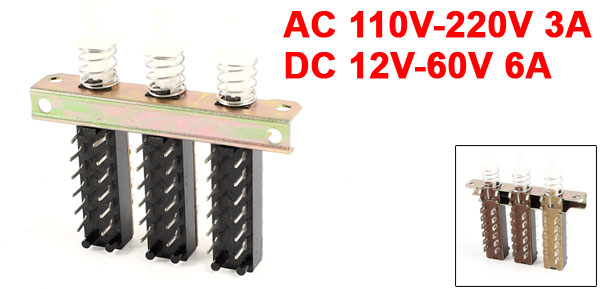 Product Name Push Button Switch Contact Type for Each Key 4PDT Key Button Number 3 Each Pushbutton Pitch 12.5mm/ 0.49" Mounting Screw Pitch 50m/ 2" Each Pin Pitch 1.6mm, 2.3mm Hole Dia 3mm Voltage/ Current AC 110V-220V 3A