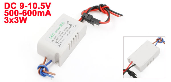 Product Name LED Driver Model 3x3W Input AC 110V/230V 50/60Hz Output DC 9-10.5V 500-600mA Output Power 3x3W JST-HX Wire Length 22cm/8.7" Wire Length(Blue, Brown) 8.5cm/3.3" Overall Size(Approx.) 5.6 x 3.2 x 2.2cm/2.2'' x 1.3'' x 0.87'' (L*W*T) Shell Material Plastic Main Color White Net Weight 29g Package Content 1 x LED Driver - Reviews