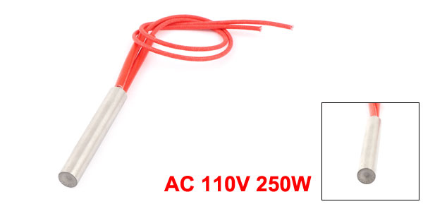 DetailsAC 110V 250W 9.5mm x 60mm Stainless Steel Heating Element Cartridge Heater  Main Color Red, Silver Tone Brand DMiotech Net Weight 27g Total Length 30cm/11.8" Country of Manufacture CHINA Package Content 1 x Cartridge Heater Rating AC 110V 250W Heater Size (Approx.) 9.5 x 60mm/0.37" x 2.4" (D * L) Material Stainless Steel, PVC, Nylon
