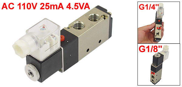 Type 5 Way 2 Position Single Head Type Power Consumption AC 110V 4.5VA 25mA Working Pressure 1.5-8kgf/cm2 Temperature 60C Joint Bore Size(Approx) G1/4", G1/8" Threaded Port Size(Approx) 13mm, 9mm Hex Connector Inner Dia(Approx) 15.5mm/ 0.61" Fix Hole Diameter 4.5mm/ 0.18", 3mm/ 0.12 Overall Size(Approx) 12.7 x 2.2 x 6.4cm/ 5" x 0.87" x 2.5" (L*W*H) Color Silver Tone, Black Indicator Color
