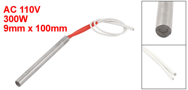 Product Name Cartridge Heater Material Stainless Steel, PVC, Nylon Rated Voltage AC 110V Power 300W Heater Size (Approx.) 9 x 100mm / 0.35" x 3.9" (D * L) Wire Length (Approx.) 26cm / 10.2" Color Red, Silver Tone