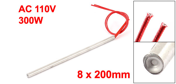 Product Name Cartridge Heater Material Stainless Steel, PVC, Nylon Rated Voltage AC 110V Power 300W Heater Size (Approx.) 8 x 200mm / 0.31" x 7.8" (D * L ) Wire Length(Approx.) 30cm / 12" Color Silver Tone, Red Net Weight 40g Package Content 1 x Cartridge Heater - Reviews