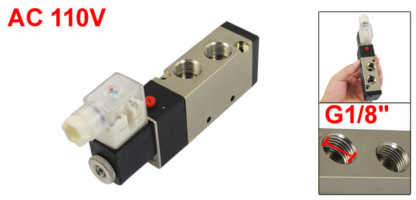 Type 5 Way 2 Position Single Head Type Power Consumption AC 110V 4.5VA 25mA Working Pressure 1.5-8kgf/cm2 Temperature 60C Joint Bore Size(Approx) Air Input=Air Output=G3/8", Exhaust=G1/4" Threaded Port Size(Approx) Air Input=Air Output=16mm, Exhaust=13mm Hex Connector Inner Dia(Approx) 15.5mm/ 0.61" Fix Hole Diameter 4.5mm/ 0.18" Overall Size(Approx) 14.5 x 2.7 x 6.7cm/ 5.7" x 1.1" x 2.6" (L*W*H) Color Silver Tone, Black Indicator Color