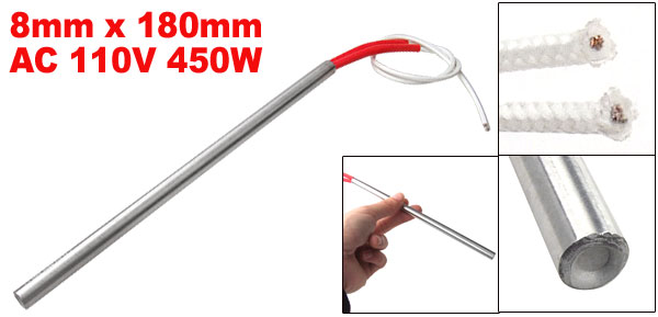 Product Name Cartridge Heater Material Stainless Steel, PVC, Nylon Rated Voltage AC 110V Power 450W Heater Size (Approx.) 8 x 180mm / 5/16" x 7.09" (D * L ) Wire Length(Approx.) 26cm / 10.2" Color Silver Tone, White Weight 58g Package Content 1 x Cartridge Heater - Reviews