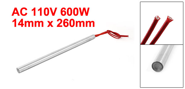 Product Name Cartridge Heater Material Stainless Steel, PVC, Nylon Rated Voltage AC 110V Power 600W Heater Size (Approx.) 14 x 260mm / 0.55" x 10.2" (D * L) Wire Length (Approx.) 26cm / 10.2" Color Red, Silver Tone