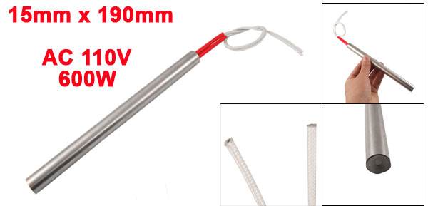 Product Name Cartridge Heater Material Stainless Steel, PVC, Nylon Rated Voltage AC 110V Power 600W Heater Size (Approx.) 15 x 190mm / 0.59" x 7.5" (D * L) Wire Length (Approx.) 27cm/ 10.6" Color Red, Silver Tone Weight 131g Package Content 1 x Cartridge Heater - Reviews
