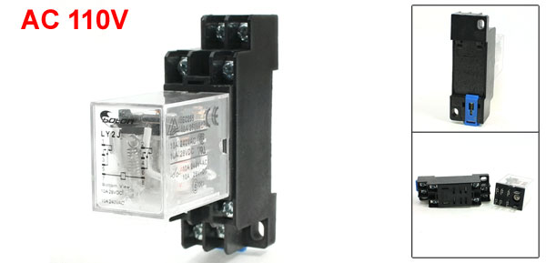 Product Name Relay with Socket Relay Model No. MY2J Coil Voltage 110VAC Contact Capacity 10A, 240VAC/28VDC Number of Pins 8 Overall Size(Approx.) 70 x 22 x 65mm/2.8" x 0.9" x 2.56"(L*W*H) Material(External) Plastic Color Clear, Black Weight 61g Package Content 1 x Relay with Socket - Reviews