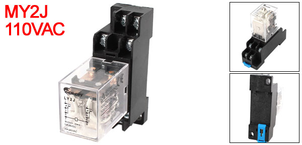 DetailsAC 110V Coil General Purpose Power Relay 8Pin 10A AC240V DC28V w Socket  Product Name Relay with Socket Relay Model No. MY2J Coil Voltage 110VAC Contact Capacity 10A, 240VAC/28VDC Number of Pins 8 Overall Size(Approx.) 70 x 22 x 65mm/2.8" x 0.9" x 2.56"(L*W*H) Material(External) Plastic Color Clear, Black Weight 61g Package Content 1 x Relay with Socket