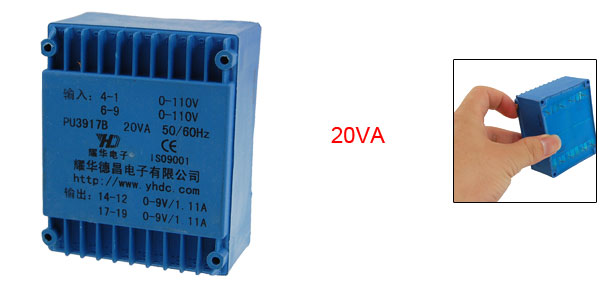 Item Name PCB Power Transformer Model PU3917B Output Voltage AC 9V 1.11A Input Voltage AC 110V Capacity 20VA Distance Between Two Pins 10mm/0.4"; 15mm/0.6" Pin Size 10 x 4mm/0.39" x 0.1579" (H*W) Total Size 68 x 55 x 32mm/2.7"x 2.2" x 1.2" (L*W*H) Color Blue Material Epoxy Resin Weight 455g Package Content 1 x PCB Power Transformer - Reviews