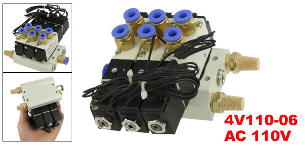 AC 110V Pneumatic Triple Solenoid Valve w Base Push In Connectors Silencers