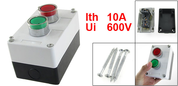 Product Name Push Button Switch Station Action Type Momentary Contact Type NO(Normally Open) Working Voltage AC 240V Working Current 3A Light Voltage 110V Ith 10A Ui 600V Uimp 6KV Push Button Diameter 2.9cm/1.14" Overall Size 11 x 7 x 6.5cm/4.3" x 2.75" x 2.5"(L*W*H) Shell Material Plastic Color Black, White Net Weight 261g Package Content 1 x Push Button Switch Station - Reviews