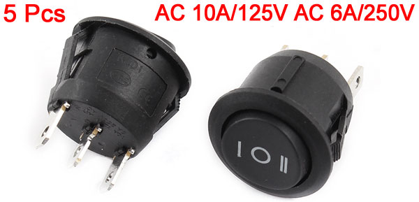 AC 125V/10A 250V/6A 3P Snap in SPST Black Round Rocker Switch 5 Pcs