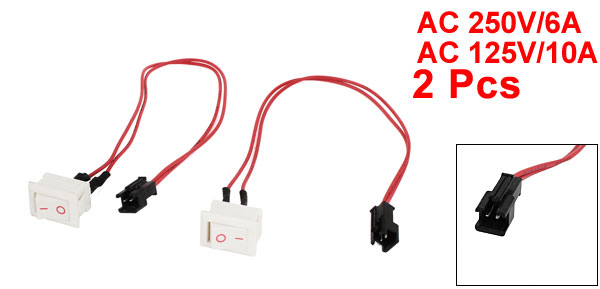 Product Name Rocker Switch Model KCD1-AP Poles SPST Terminals 2 Pin Rating Voltage AC 250V/6A, AC 125V/10A Body Size(Each One) 2 x 1.5 x 1.8cm / 0.8" x 0.6" x 0.7"(L * W * T) Wire Length 23cm/ 9" Color White, Red Material Plastic, Metal Total Weight 13g Package Content 2 x Rocker Switch - Reviews