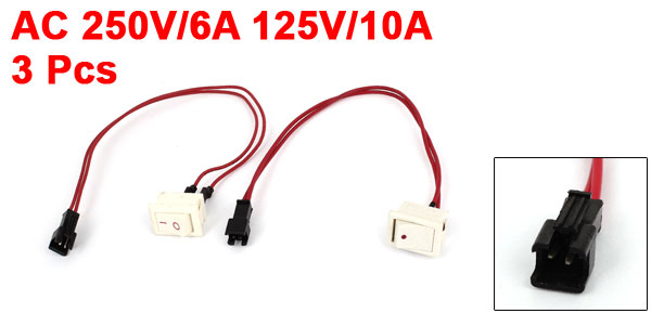 Product Name Rocker Switch Model KCD1-AP Poles SPST Terminals 2 Pin Rating Voltage AC 250V/6A, AC 125V/10A Body Size(Each One) 2 x 1.5 x 1.8cm / 0.8" x 0.6" x 0.7"(L * W * T) Wire Length 23cm/ 9" Color White, Red Material Plastic, Metal Total Weight 17g Package Content 3 x Rocker Switch - Reviews