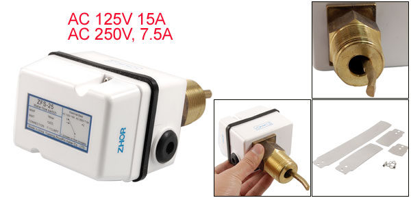 Product Name Flow Switch Model No. ZFS-25 Thread Dia(Approx) 31.5mm / G1" Connection 1"-11 1/2" Max. Water Pressure 16Bar Medium Temperature -10°C - 90°C Contact Capacity AC 125V 15A; AC 250V, 7.5A Overall Size(Approx) 8 x 5.8 x 15.5cm / 3.1" x 2.3" x 6.1"(L*W*H) Material Metal Color White & Gold Tone Net Weight 528g Package Content 1 x Flow Switch