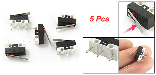 Product Name Micro Switch Material Plastic, Metal Model WD-010 Rated Load AC 1A 125V Contact Resistance </=0.02Ω Insulating Resistance >/=100MΩ Operating Force 60-100 Withstand Voltage AC 250V(50Hz)/Min Mechanical Life 100000 Time Temperature Range -40-70°C Lever Size (Approx.) 13 x 4mm / 1/2" x 1/8" (L * W ) Size (Approx.) 13 x 5 x 10mm / 1/2" x 7/32" x 3/8" (L * W *T ) Color Black, White, Red Weight 3g Package Content 5 x Micro Switch - Reviews