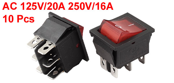 Product Name Rocker Switch Connection Type DPDT Position 2 Terminals Number 6 Voltage/Current AC 125V/20A 250V/16A Total Size(Each) 31 x 25 x 29mm/ 1.2" x 1" x 0.75"(L*W*H) Mounted Size 30 x 21mm/ 1.2" x 0.8"(L*W) Switch Color Black, Red Material Plastic, Metal Weight 125g Package Content 10 x Rocker Switches - Reviews