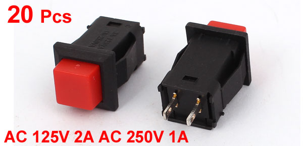 DetailsAC 125V/3A 250V/1A 2 Pin Latching SPST Red Square Head Push Button Switch 20PCS  Main Color Black, Red Overall Size 28 x 14 x 15mm/1" x 0.6" x 0.6"(L*W*T) Country of Manufacture CHINA Action Type Latching Material Plastic ,Metal Contact Configuration SPST Terminals Quanlity 2 Pins Product Name Push Button Switch Net Weight 61g Package Content 20 x Push Button Switch Mounting Size 12 x 10mm/ 0.5" x 0.4"(L*W) Rating Voltage AC 125V 2A AC 250V 1A Button Size 9 x 9mm/ 0.4" x 0.4"(L*W)