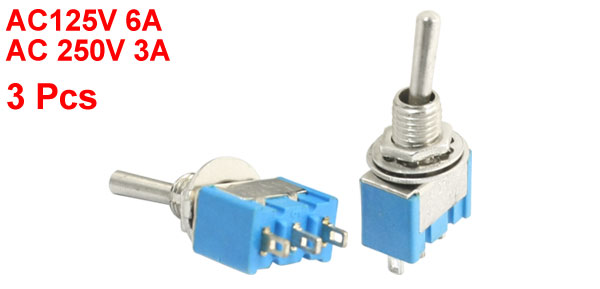 AC 250V 3APosition Number 3 Actact Type SPDT Thead Dia(Approx) 6mm / 0.24" Pitch 4mm Body Size 13 x 10 x 8mm/0.51" x0.4" x 0.31" (L*W*T) Total Height 3.2cm / 1.3" Material Plastic, Metal Color Blue, Silver Tone Weight 14g Package Content 3pcs x Toggle Switch - Reviews