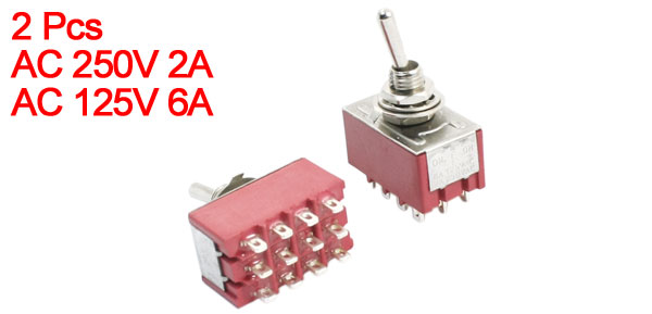 DetailsAC 125V 6A 4PDT ON/OFF/ON 3 Positions 12 Pin Electric Toggle Switch Red 2pcs  Product Name Toggle Switch Type 4PDT (Latching) Position 3 Positions (ON/OFF/ON) Voltage, Current AC 250V 2A
