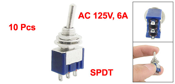 Product Name Toggle Switch Model No. MTS-102 Rated Voltage & Current AC 125V, 6A Pin Number 3 Pins Position 2 Positions(ON/ON) Type SPDT(Latching) Mounting Hole Diameter 5.8mm / 0.23" Body Size(Approx.) 13 x 8 x 9.7mm / 0.5" x 0.3" x 0.38"(L*W*T) Total Height 33mm / 1.3" Material Plastic, Metal Weight 50g Package Content 10 Pcs x Toggle Switch - Reviews