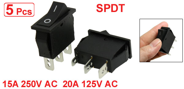 Product Name Rocker Switch Poles SPDT Terminals 3 Pin (On-On) Rating Voltage AC 250V 15A AC 125V 20A Total Size(Each One) 3 x 1.4 x 3.8cm/ 1.2" x 0.55" x 1.5"(L*W*T) Mounting Size 2.6 x 1 x 3cm/ 1" x 0.4" x 1.2"(L*W*T) Color Black Material Plastic, Metal Total Weight 35g Package Content 5 x Rocker Switch - Reviews