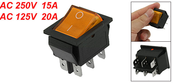 Item Name Rocker Switch Type On On (DPDT) Each Size 3.3 x 2.5 x 3.5cm / 1.3" x 1" x 1.4"(L*W*H) Voltage&Current AC 250V ,15A AC 125V ,20A Installation Size 3.1 x 2.1 x 2.6cm/1.2'' x 0.8'' x 1''(L*W*H) Mount Hole Size 2.7 x 2.0cm / 1.1" x 0.85"(L*W) Light Color Orange Housing Color Black, Orange Material Plastic & Metal Total Weight 14g Package Content 1 x Rocker Switch - Reviews